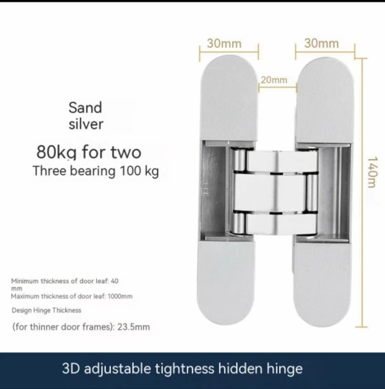 Ciężki niewidzialny zawias to 3D-ADJUSTABLE CONCELED HINGE, co oznacza, że można go regulować w trzech wymiarach, umożliwiając łatwą instalację i dostosowanie.Zębaty wykonane są z wysokiej jakości materiałówZ maksymalnym obciążeniem 120 kg zawias ten może z łatwością utrzymać nawet najcięższe drzwi.